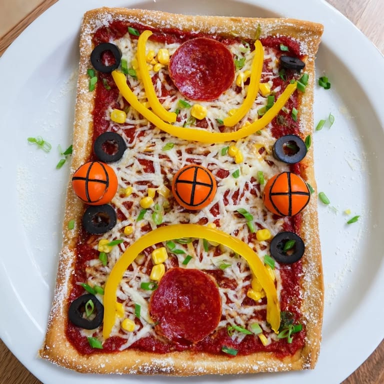 Roll out the dough into a rectangle and use sliced bell peppers to outline court lines. Yellow peppers form outer boundaries, red peppers mark the center circle and key. Olives and corn create free throw and three-point line details.