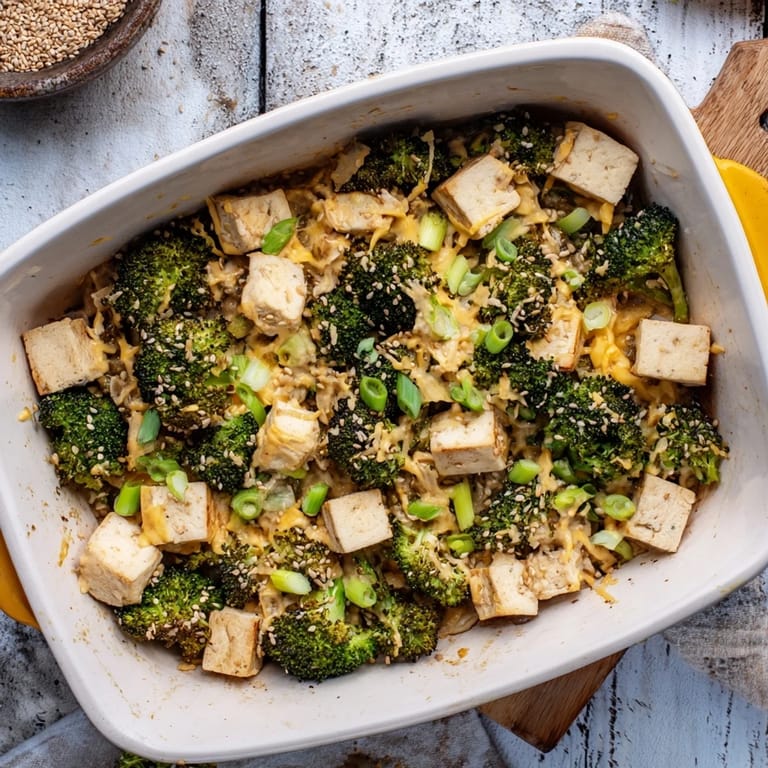 Save A vibrant, plant-based casserole blending crispy tofu and roasted broccoli in a creamy, cheesy sauce with an umami-rich sesame-ginger twist.