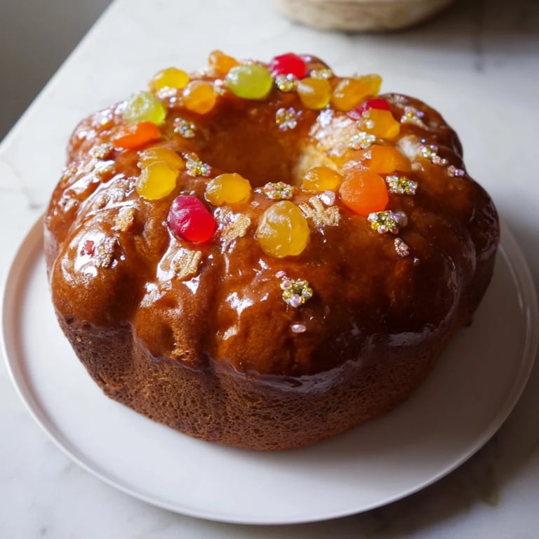 It is a festive French bread shaped like a crown, embellished with colorful candied fruits and sugar pearls.