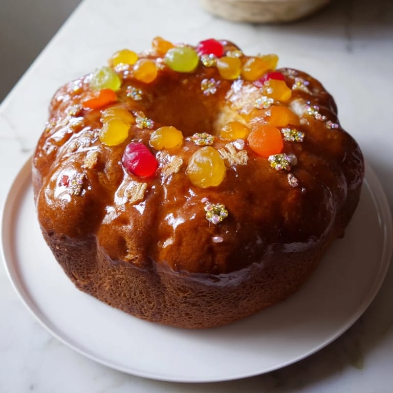 Save A festive and dazzling sweet bread shaped like a crown, adorned with colorful candied fruits and sugar pearls—a showstopping centerpiece perfect for celebrations.