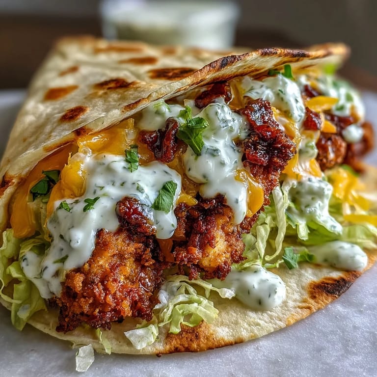 - Spread ranch sauce on the cheese side of each tortilla. Top with smashed chicken, pickles, red onion, and lettuce. Add extra ranch if you want and serve immediately.