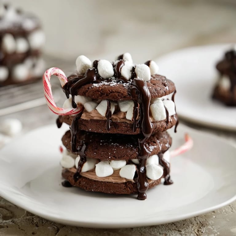 Save A playful, decadent dessert featuring layers of chocolate cookies and fluffy marshmallow frosting, stacked to resemble a cozy mug of hot cocoa.