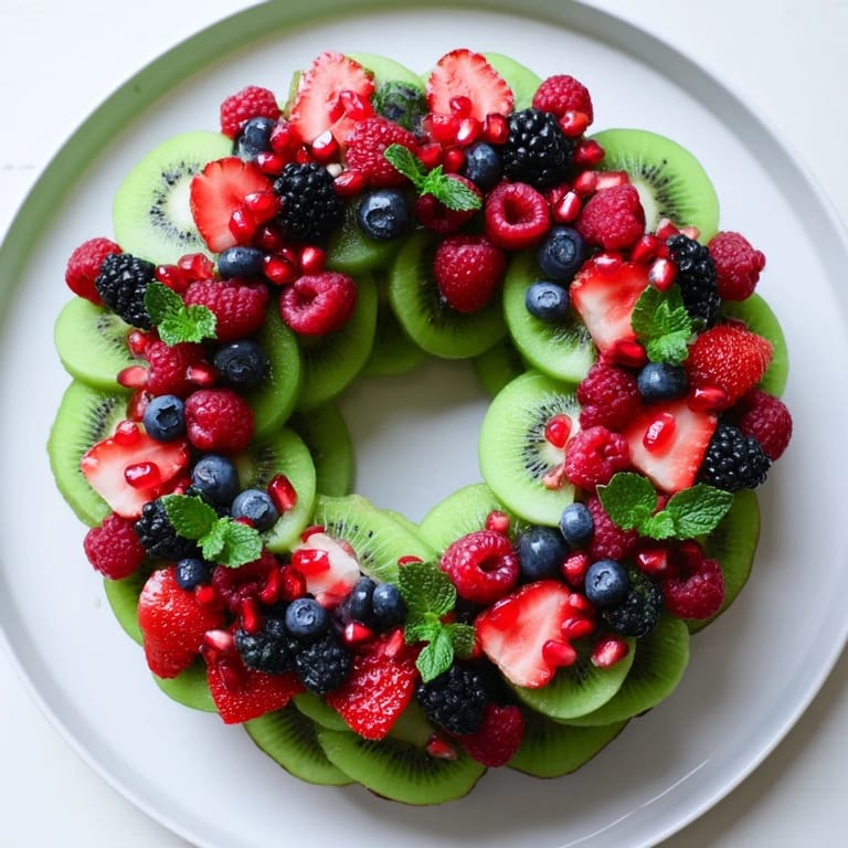 Save A festive and vibrant fruit platter arranged in the shape of a wreath, featuring juicy kiwi slices and an assortment of fresh berries& perfect for holiday gatherings.