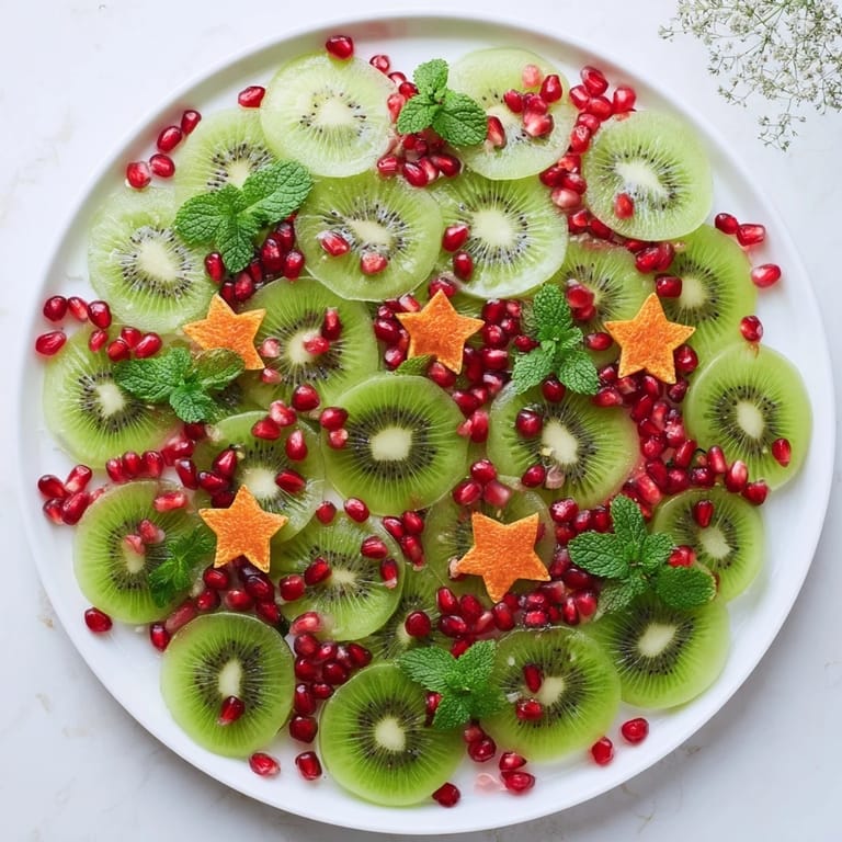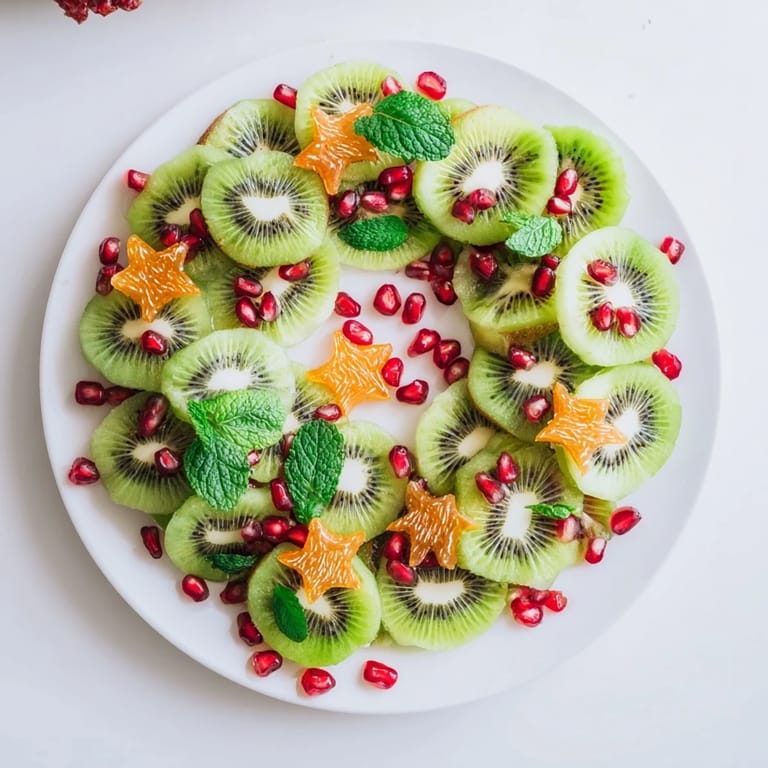 Save A festive and vibrant fruit platter arranged in the shape of a holiday wreath, featuring fresh kiwi and sparkling pomegranate seeds—a showstopping, healthy dessert or appetizer.