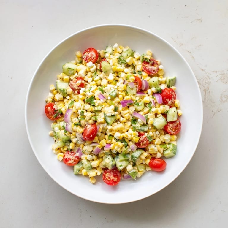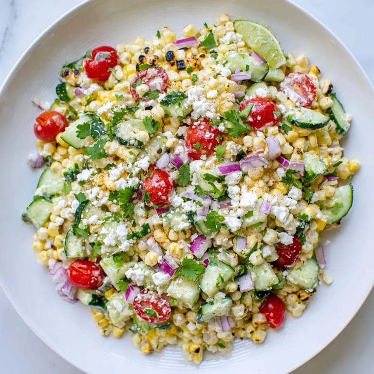 Save A vibrant, zesty salad inspired by classic Mexican street corn (elote), featuring sweet corn, creamy dressing, fresh vegetables, and a hint of spice—perfect for picnics, barbecues, or a refreshing side dish.
