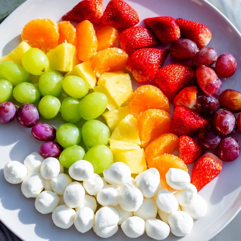 Creating this snack board allows you to engage with fresh produce in a fun, creative way. The arrangement in a rainbow arc topped with 'clouds' of mozzarella or marshmallows adds an imaginative touch that kids and adults alike will appreciate. With minimal prep time and no cooking involved, it’s a stress-free option that brings a burst of color and flavor to any setting.