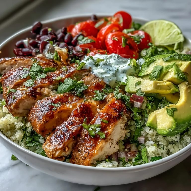 This bright, nourishing bowl combines fluffy cauliflower rice infused with lime and cilantro zest with tender, seasoned chicken breast. Fresh black beans, cherry tomatoes, diced red onion, and creamy avocado add layers of texture and flavor, balanced by a dollop of tangy Greek yogurt. Quick to prepare and satisfying, it offers a nutritious and vibrant option that’s easy to customize for different tastes and dietary needs.