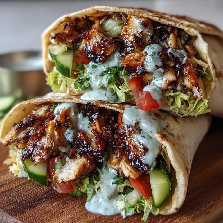This Middle Eastern favorite brings together tender, spice-marinated chicken thighs grilled to perfection and wrapped in soft pita bread. The aromatic blend of cumin, coriander, paprika, turmeric, and cinnamon creates authentic shawarma flavor, while the cool creamy garlic sauce balances the warm spices beautifully. Fresh vegetables like crisp cucumbers, juicy tomatoes, and shredded lettuce add refreshing crunch, complemented by tangy pickles for that perfect zing. Ready in under two hours with most time spent hands-off during marinating, these wraps make an impressive yet approachable meal that transports your kitchen to the streets of the Middle East.