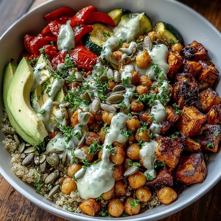 This wholesome bowl combines protein-rich chickpeas with roasted sweet potatoes, bell peppers, and zucchini over a bed of fluffy quinoa. The legumes get a warm spice blend of smoked paprika and cumin while roasting until crispy. A velvety tahini-lemon dressing ties everything together, with fresh avocado, cherry tomatoes, and herbs adding brightness and texture. Perfect for meal prep, each serving delivers complete plant-based protein.