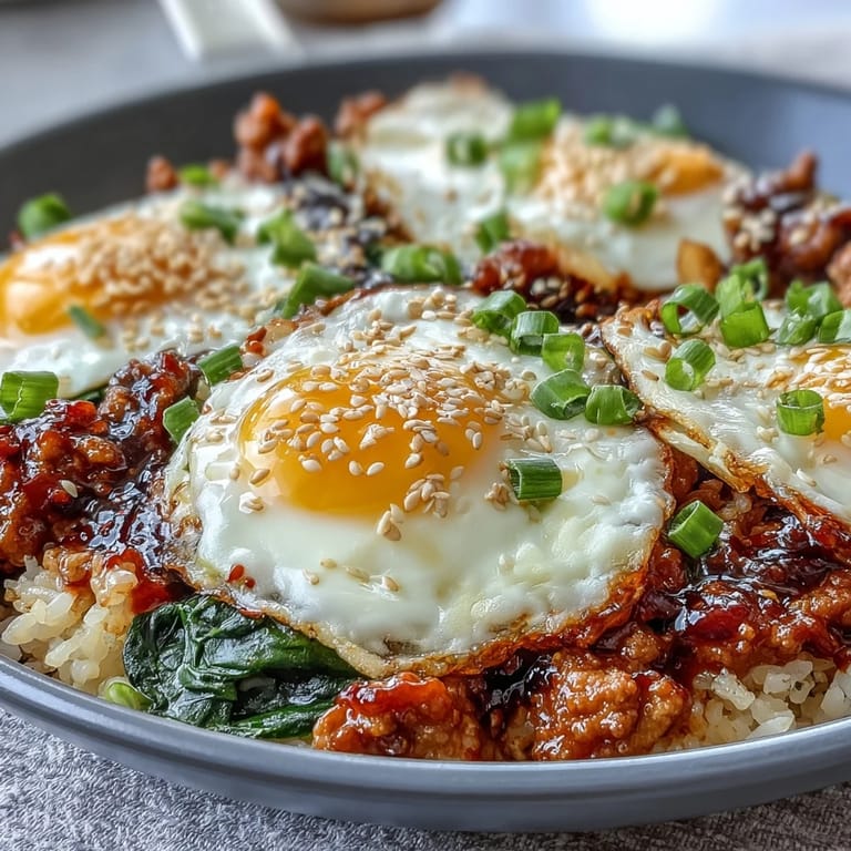 This vibrant one-pan skillet combines ground turkey with a sweet and spicy Korean-inspired sauce made from gochujang, soy sauce, honey, and rice vinegar. The savory mixture gets folded with fluffy short-grain rice and baby spinach, then topped with perfectly cooked jammy eggs for added richness. Finished with scallions, sesame seeds, and optional kimchi, this Korean Fusion dish delivers restaurant-quality flavors in just 40 minutes. The optional cream creates an extra silky texture, while the balance of protein, vegetables, and rice makes it a complete satisfying meal any night of the week.