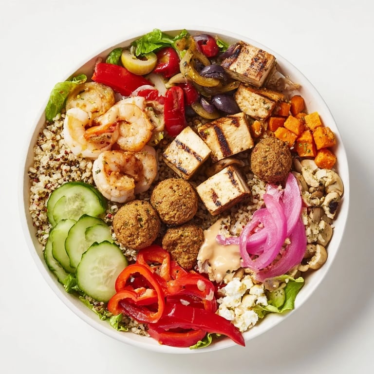 - Invite everyone to create their own boards or bowls by layering a base, then adding proteins, vegetables, toppings, and sauces finished with fresh herbs.