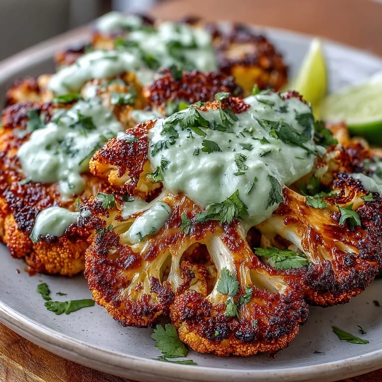 Save Roasting cauliflower as "steaks" transforms this humble vegetable into a hearty centerpiece. The high heat of the oven caramelizes the edges, while the chili-lime infusion ensures a depth of flavor that pairs beautifully with the cooling lime-infused crema.