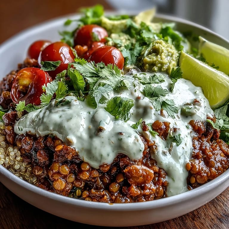 This wholesome bowl blends spiced lentils and quinoa simmered with fragrant spices and vegetable broth until tender. It’s topped with a smooth avocado lime crema made from ripe avocado, plant-based yogurt, lime juice, and fresh garlic. Bright toppings like cherry tomatoes, corn, sliced green onions, and cilantro add texture and freshness. Each serving offers a balanced, hearty meal packed with plant-based protein, vibrant flavors, and a zesty finish from lime wedges. Easy to prepare in one pot for a satisfying vegan and gluten-free option.