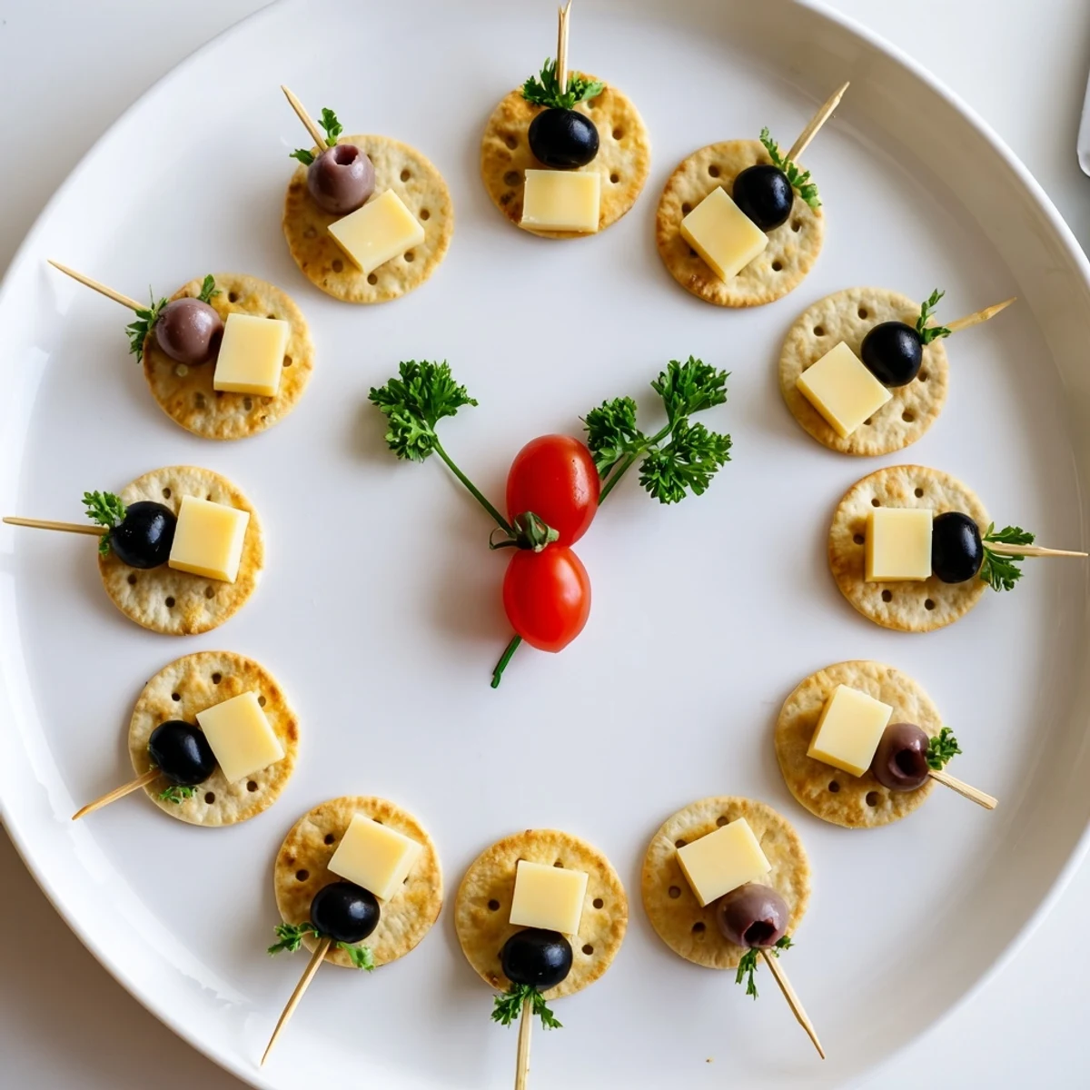- 24 round crackers: These are your clock face foundation—they keep their shape beautifully and won't go soft. I learned to choose sturdy crackers that won't bend under the weight of the olives