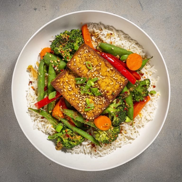 This dish features golden, crispy pressed tofu steaks complemented by a colorful mix of stir-fried frozen vegetables and fluffy rice. The tofu is marinated in a blend of soy sauce, garlic powder, smoked paprika, and pepper before being seared to perfection. Vegetables are quickly stir-fried with garlic and soy sauce, creating a vibrant side that pairs wonderfully with the rice. Ideal for a quick, nourishing meal featuring Asian-inspired flavors and plant-based ingredients.