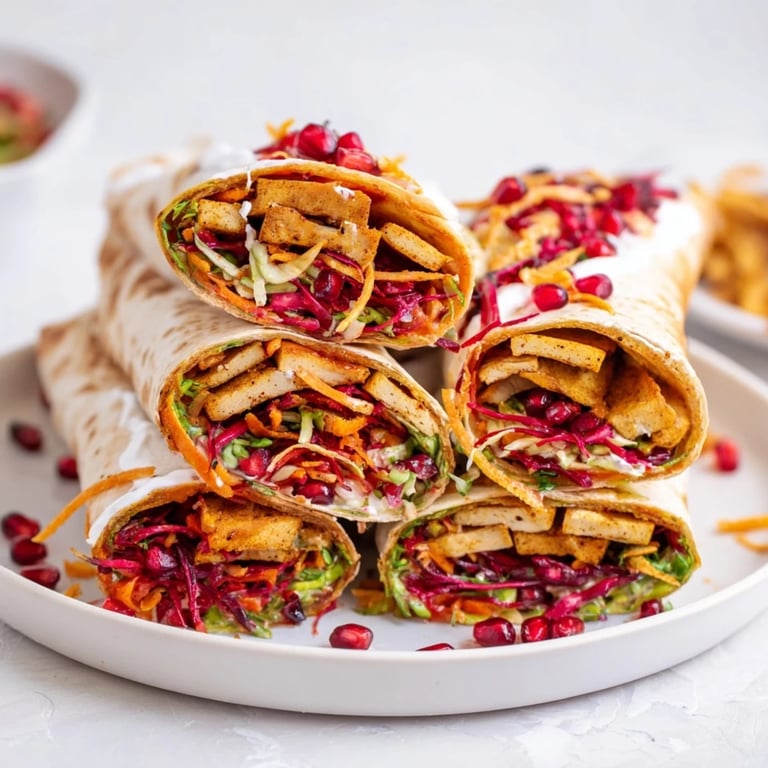 Save A vibrant, crispy wrap featuring sweet chili-glazed tofu, crunchy vegetables, and a festive slaw—perfect for a plant-based holiday meal or a flavorful weeknight dinner.